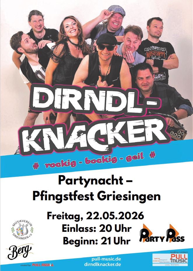 Am Freitag, 22.05.2026 heizt die Partyband DIRNDLKNACKER das Festzelt ab 21 Uhr so richtig ein.